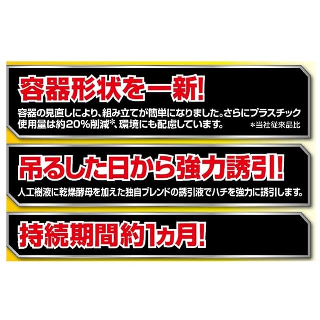 人工樹液に乾燥酵母を加えた独自ブレンドの誘引捕獲液でハチを強力に誘引します。
