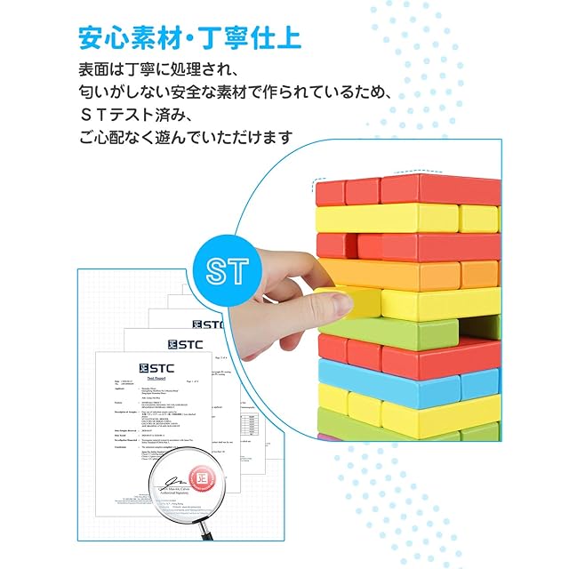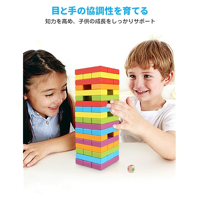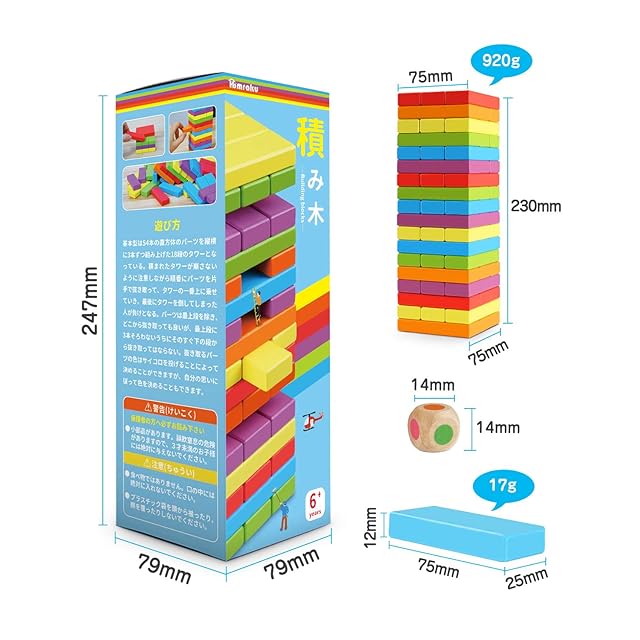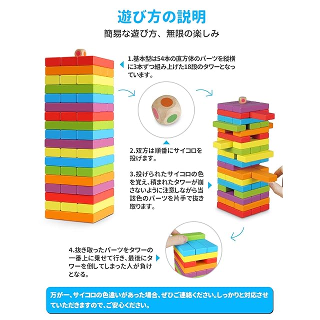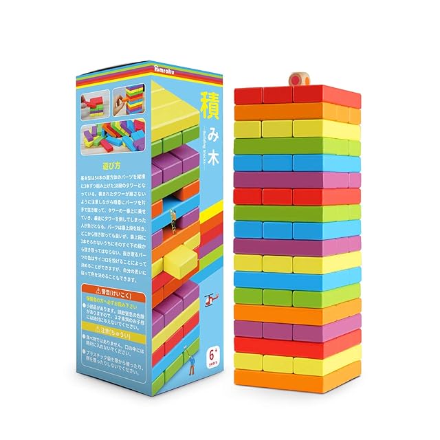 【遊び方】:積み木は積まれたブロックタワーの中から、順番にブロックを片手で抜き取ってタワーの一番上に載せていき、最後にタワーを倒してしまった人が負けとなるクラシックゲーム。