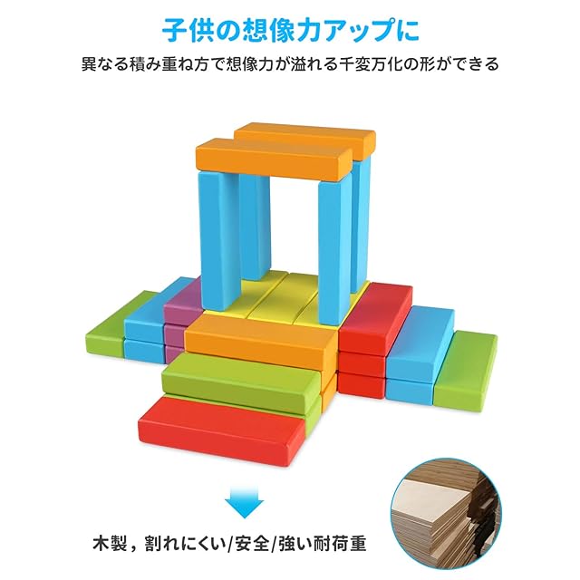 【創造力を育てる】:6色のカラフルブロックのため、様々な組み方が可能。ドミノ ブロックとしたり、積み木にしたりなど楽しく組み立てることもでき、想像力・創造力が広がる