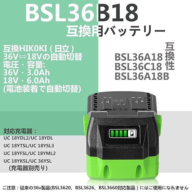 仕様: BSL36B18 HiKOKI/ハイコーキ/日立工機 互換バッテリー (BSL36A18/BSL36C18/BSL36A18B 互換用) 種類:リチウム電池 電圧:36V・ 18V(電池装着で自動切替) 容量:3Ah ・6.0Ah(電池装着で自動切替) 36Vマルチボルトシリーズと従来の18V製品を互換できます (*総計114モデル) ご注意:従来の36v製品(BSL3620、BSL3626、BSL3660対応製品)にはご使用になれません。 11.6 x 7.6 x 6.9cm 640g 電池残量表示(4段階)搭載 純正充電器対応 充電時間: UC 18YDL2 30分 UC 18YDL 30分 UC 18YTSL 37分 UC 18YSL3 37分 UC 18YFSL 85分 UC 18YML2 40分 UC 18YKSL 170分 UC 36YSL 60分