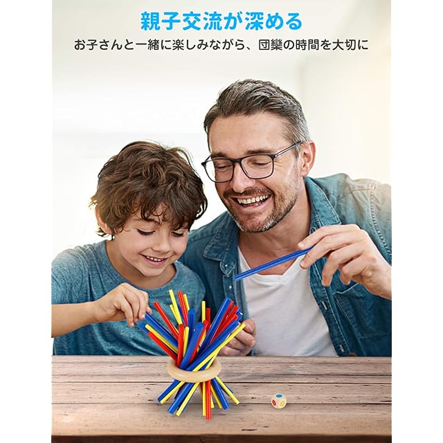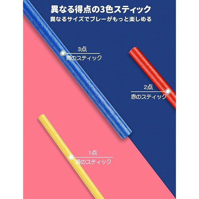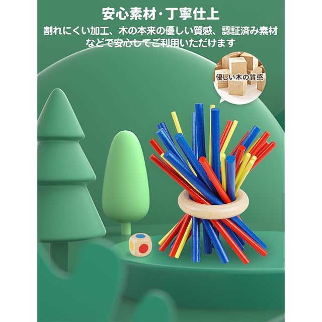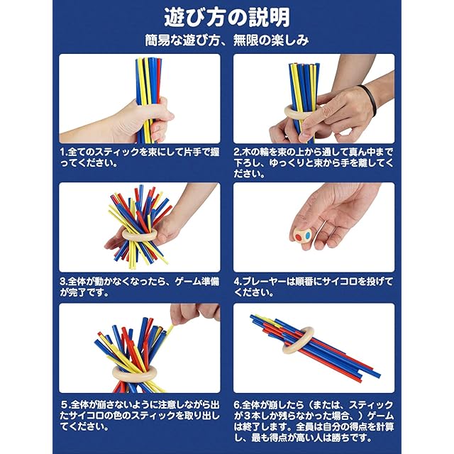 【取り付け方と遊び方】全てのスティックを束にして片手で握り、木の輪を束の上から通して真ん中まで下ろし、ゆっくりと束から手を離してください。全体が動かなくなったら、ゲーム準備が完了です。プレーヤーは順番にサイコロを投げ、全体が崩さないように注意しながら出たサイコロの色のスティックを取り出します。全体が崩したら(または、スティックが3本しか残らなかった場合、)ゲームは終了し、最も得点が高い人は勝ちです。(青1本3点、赤1本2点、黄1本1点、最後にとったスティックの点数は計算対象外です。)
