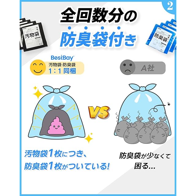 ✅【汚物袋と防臭袋が1:1で同梱】BestBayの汚物袋と防臭袋が1:1の割合でセットになっており、二重包装により臭い漏れをしっかりブロック。さらに、各袋は20枚ずつ個別包装されているため、使いやすく衛生的です。災害時でも快適で清潔なトイレ環境を実現します。