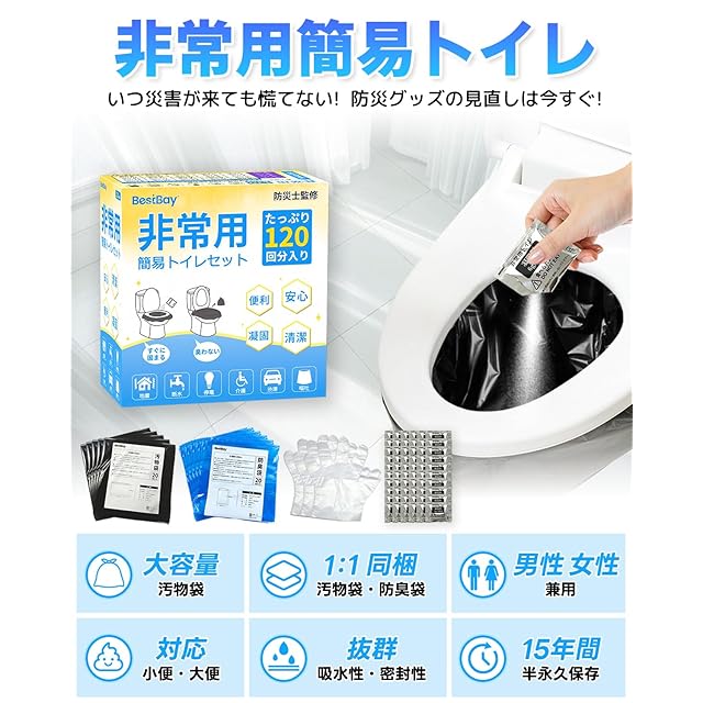 簡易トイレ【防災士監修】BESTBAY 非常用トイレ 120回分 15年保存 防災グッズ 携帯トイレ 防臭袋 汚物袋 凝固剤 防災トイレ 長期保管 手袋付き 持ち運び易い コンパクト 地震対策 断水対策 災害対策 (120回分) | つむぎ屋