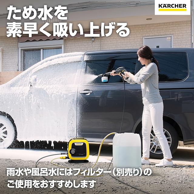 水道が近くにない場所ではバケツやタンクなどにためた水を使用して、水道がある場所では蛇口に接続して水道から給水し高圧洗浄できます。