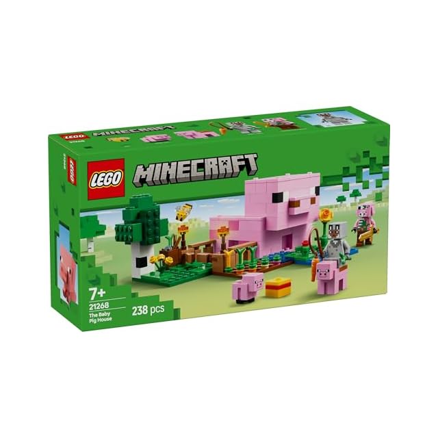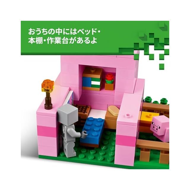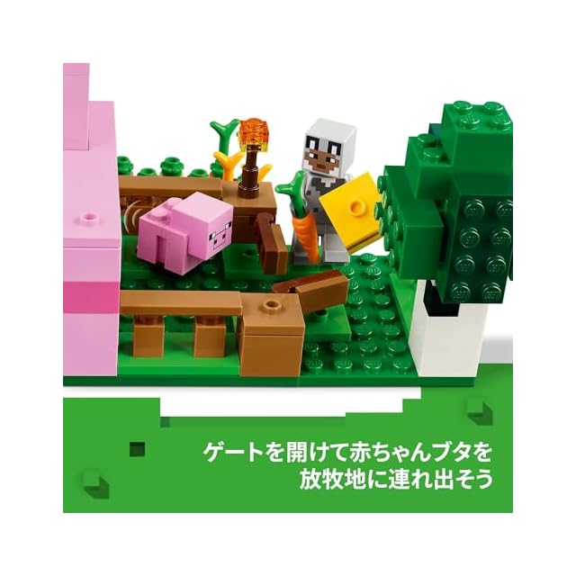 レゴマインクラフト 赤ちゃんブタのおうち – ブタの形をした家の周りに農場をつくり、ジャガイモやビーツを育て、ゲートで囲った放牧地で赤ちゃんブタを育てよう