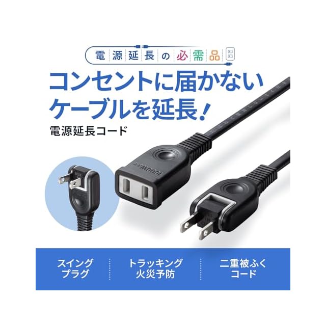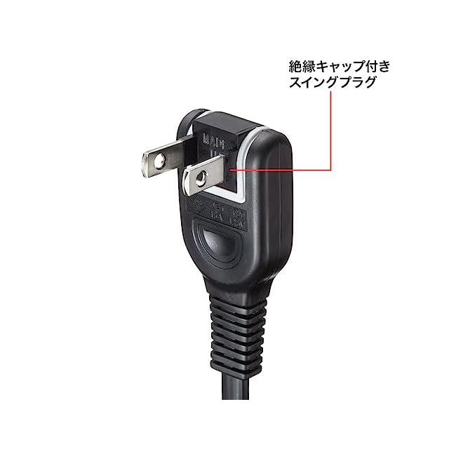 タップや機器の電源延長に便利。トラッキング火災防止絶縁キャップ付スイングプラグ採用の延長コード