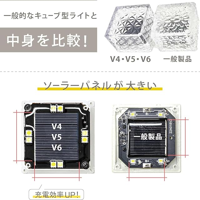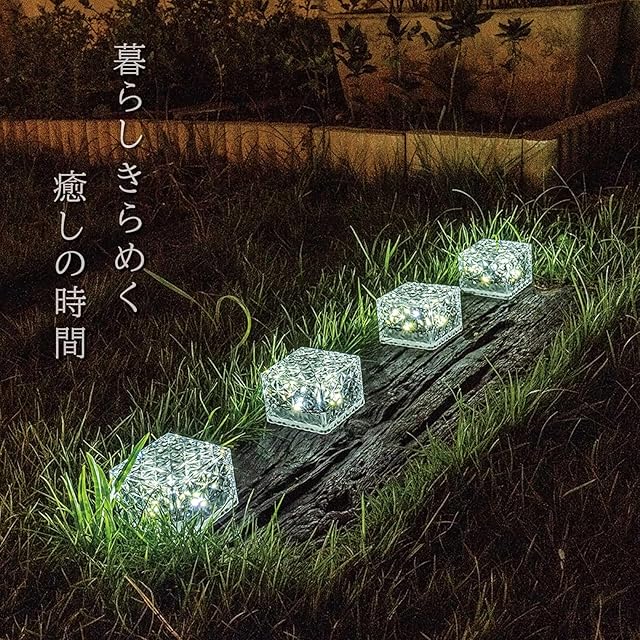 【選ばれる理由】 従来のキューブ型ガーデンライトよりも性能UP [ パネルサイズ:43×39mm → 充電効率UP ] [充電池容量:800mAh → 連続点灯時間UP] [LEDチップ:5050×4個 → 明るさUP] [当店だけのオリジナルデザイン:意匠権申請済] 従来よりも明るくて長時間点灯、キラキラ反射するオリジナルデザインが綺麗でかわいいと大評判。