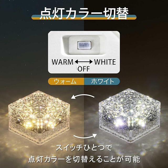 【製品仕様】 明るさ:5ルーメン、カラー WARM:3000K / WHITE:7000K、 リチウムイオン充電池:800mAh 1.2V、連続点灯:最大約10時間(フル充電時)、 防水性能 IP65、サイズ:幅70mm、奥行70mm、高さ 51mm、重量:144g/個、 【メーカー180日&充実のサポート】 操作などお困りの際はお気軽にお問い合わせ下さい。説明書記載のメールアドレスから販売店にご連絡ください。