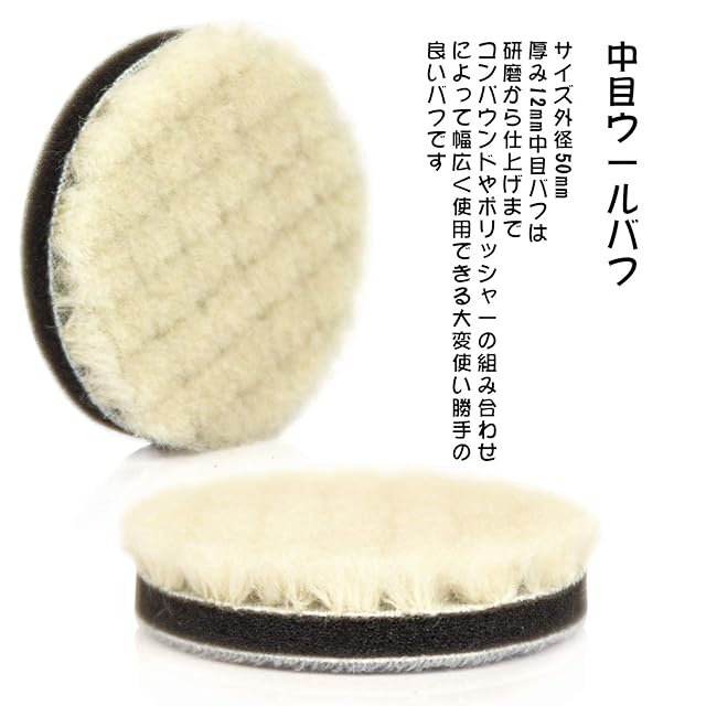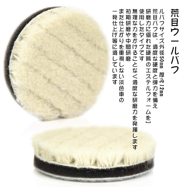 【セット内容】:6個セット 直径:125mm;厚み:15mm。素材:100%天然ウール。 【細目バフ】:研磨作業と最終仕上げ作業によって作られた磨き目の加工に適した研磨剤です。 同時に使用する化合物などを組み合わせることで、暗い車ならではの淡い黄色の目や最終的な鏡面仕上げの加工に使用できます。