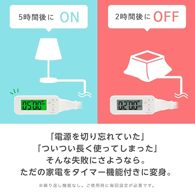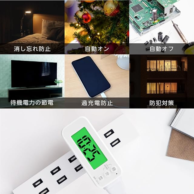 1分単位おの23時間59分までのON/OFFタイマー機能で、節電や外出時の防犯、就寝時のスイッチの切り忘れ防止、スマホなどの過充電防止、タイマー機能のない家電の自動オン/オフなどに役立ちます。