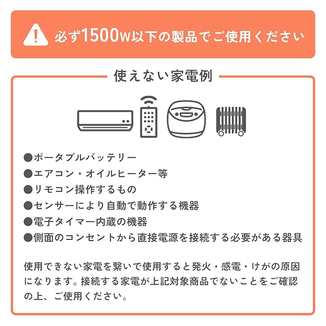 ※1500W以下の製品で使用してください【使えない家電例】エアコン、オイルヒーター等/リモコン操作するもの/センサーにより自動で動作する機器/電子タイマー内蔵の機器/壁面のコンセントから直接電源を接続する必要がある器具。 ※防水・防塵構造ではないため、湿気の多い場所や水のかかる場所での保管・使用はしないでください。 ※スマホと接続する機能はありません。