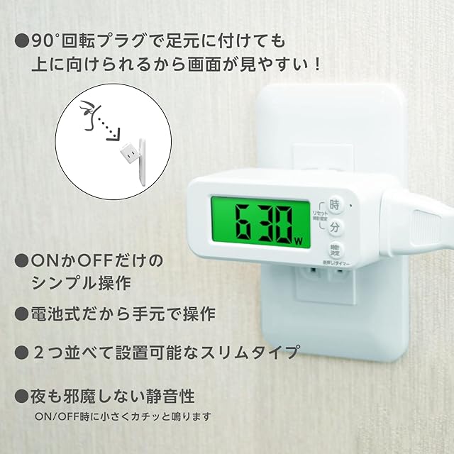 90°回転プラグを採用しており、上向きに設置でき、足元にあるコンセントでも見やすい角度にすることができます。 電池式を採用し、狭い場所にあるコンセントに使用する際に手元で設定できます。(電池なしでもコンセントに刺せば使用できます)