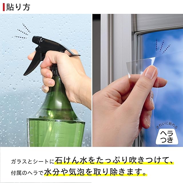 【カンタン貼りつけ】ガラスとシートに石けん水を吹き付けて、貼るだけカンタン!密着用ヘラ付!