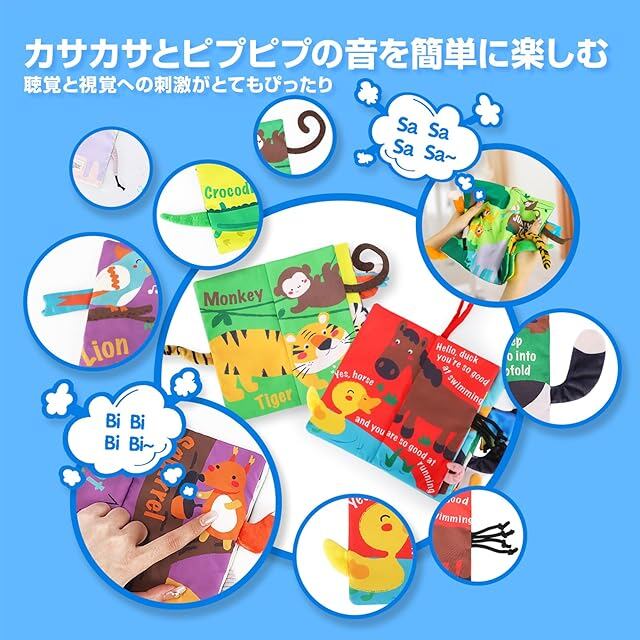 beiens 布絵本 布のおもちゃ 赤ちゃん 洗える【ピーピーの音が出てくる】 【動物シリーズ・3Dアクティビティブック】 おでかけ布えほん 幼児 0歳から 指遊び 歯がため ベビーカー用おもちゃ 知育玩具 幼稚園 出産祝い 子供 2冊セット | つむぎ屋