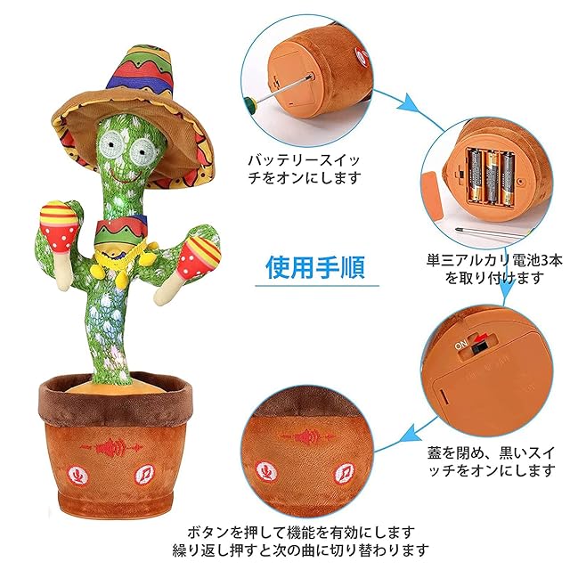 【サボテン おもちゃ 使用上の注意点】1.音楽再生機能:サボテンの右ボタン-1回押して曲を切り替えて、3秒長押しして曲を2回繰り返します。2.録音機能:サボテンの左ボタンを数秒間押して、「di」の音を聞くまで、それから自分の音を録音することができます。 話が終わったら、左ボタンを放してください。もう一度左ボタンを押すと録音が再生されます。新しい録音を行う場合は、上記の手順を繰り返します。3.バッテリは含まれていません 。4. 使用しない場合は、バッテリを取り外す必要があります。 不必要な損失を招くことがないようにします。