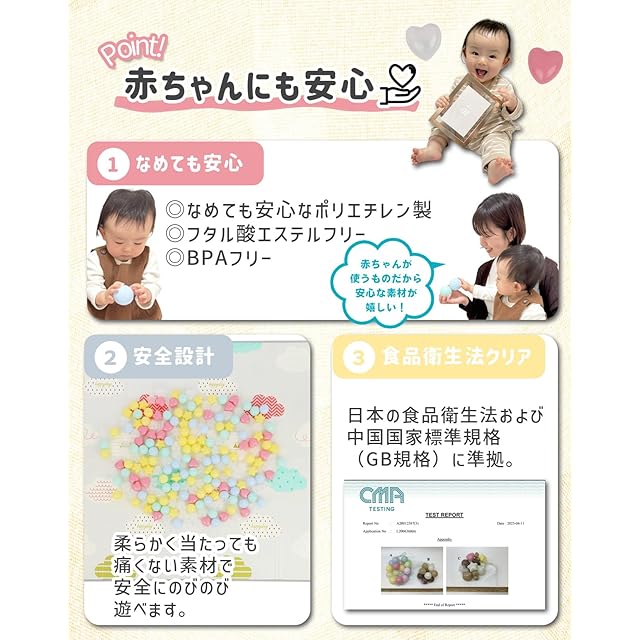 【赤ちゃんが安心して遊べるボール】丸形カラーボールは直径5.5cm、ハート形・星形カラーボールは直径6cmなので赤ちゃんの小さな手でも握りやすい大きさです。また口に入れることができない大きさなので誤飲の心配がありません。なめても安心なポリエチレンを使用。柔らかいので体にボールが当たっても痛くありません。ボールをギュッと押してへこんでも元に戻ります。中国国家標準規格GB規格(中国版JIS)クリア済み。食品衛生法クリア済。フタル酸エステル、BPAは使用していません。