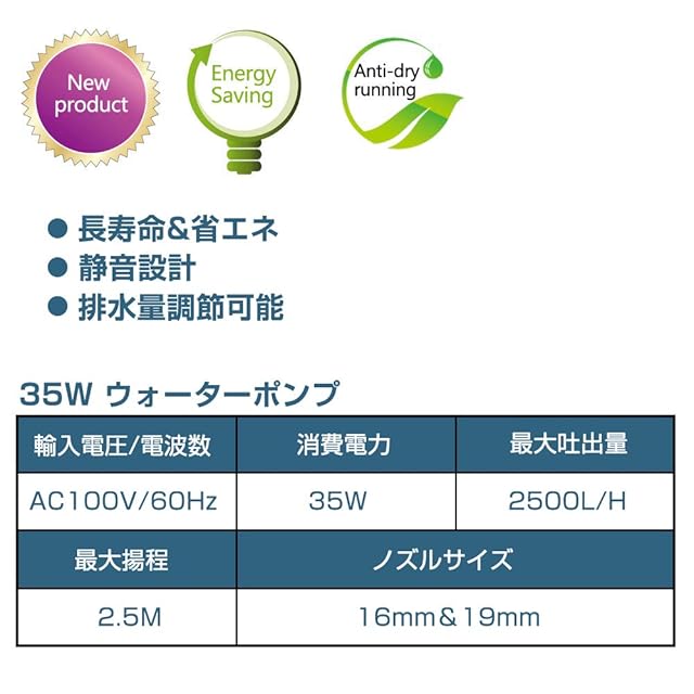 【規格】☆入力電圧:AC 100V/60Hz ☆電力:35W ☆最大揚程:2.5Mぐらい ☆吐き出し口外径:16mm&19mm ☆最大流量:2500L/H ☆騒音クラス:40デシベル以下 ☆電源コードの長さ:1.9M