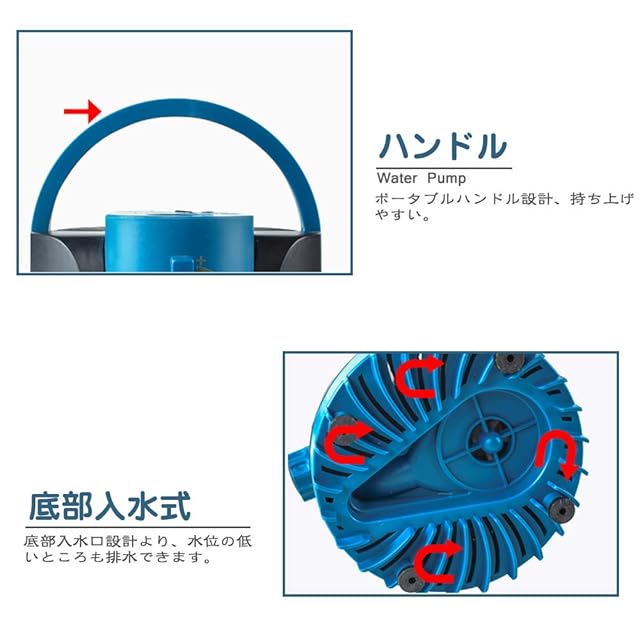 【排水量調節可能】側部には回転盤があって、流量が調整できます。流量の調整を通して、揚程の高さも調整できます。