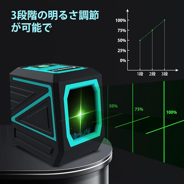 3. 3 段階の明るさ調節:レーザー墨出し器 Janmifly LL2G は 3 段階の明るさ調節機能を備えており、使用シーンに合わせて明るさを選ぶことができます。