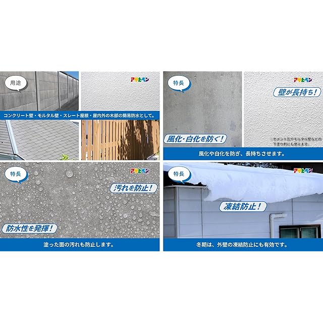 用途:(屋内外区分:屋外用)コンクリート壁やモルタル壁、木部、スノコなどの防水に。シーラーとしてセメント瓦・カラーベスト、コロニアルなどの下塗りに。モルタル壁などの下塗りに。