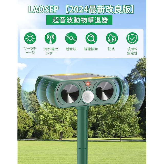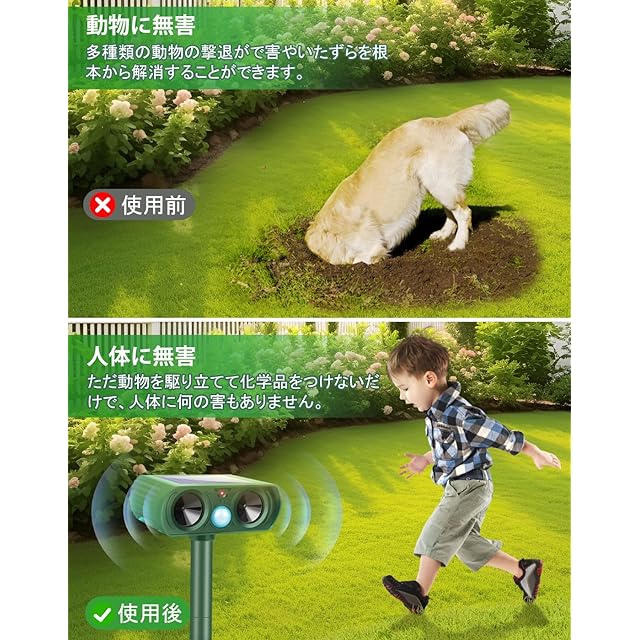 【動物撃退器駆除原理】2024年新改良版の動物撃退器は、赤外線検知エリア、超音波周波数、検知範囲が広くなり、より多様な動物に対応でき、撃退効果も向上しています。動物を検知すると、超音波スピーカーから動物が嫌がる超音波を発生させます。動物は機械に慣れる習性がありますが、本製品は自動周波数制御の超音波を使用することで、動物が慣れるのを防ぎます。動物を傷つけずに追い払うことができるリペラーです。
