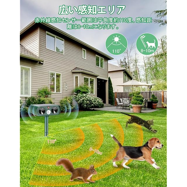 【赤外線自動感知・広い感知エリア】赤外線自動感知で害獣などを感知。動物が検出範囲に入る時、赤外線センサーで超音波スピーカーをトリガーし、音、警報。猫、鳥、犬、ネズミ、キツネ、アライグマ、その他の動物を追い払う。この動物駆除器は、家の周りの環境を破壊から守ることができ、動物を追い払うのに最適です。こちらの動物撃退器は感知エリアが広くて、赤外線自動感知センサー範囲は平角度約110度、感知距離の最大直径約8m-11mになります。注意:使用環境、動物の大きさ、天気、製品の電量などによって、感知範囲に多少誤差があります。