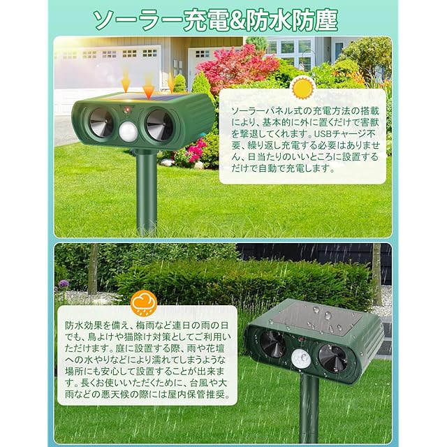 【ソーラー充電・防水防塵】ソーラーパネル式の充電方法の搭載により、基本的に外に置くだけで害獣を撃退してくれます。USBチャージ不要、繰り返し充電する必要はありません、日当たりのいいところに設置するだけで自動で充電します。防水効果を備え、梅雨など連日の雨の日でも、鳥よけや猫除け対策としてご利用いただけます。庭に設置する際、雨や花壇への水やりなどにより濡れてしまうような場所にも安心して設置することが出来ます。長くお使いいただくために、台風や大雨などの悪天候の際には屋内保管推奨。