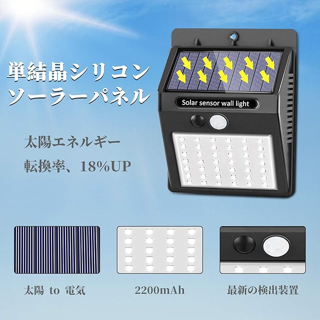 【2200mAh電池内蔵・連続照明10時間】2022最新改良版センサーライト、高輝度42LEDライトを備え、照明時間/明るさはLED数量と関係せず、2200mAh電池内蔵、従来品より明るくなり、照明時間10時間でき、照明角度も最大150°に達し、照明の範囲がより広いです。