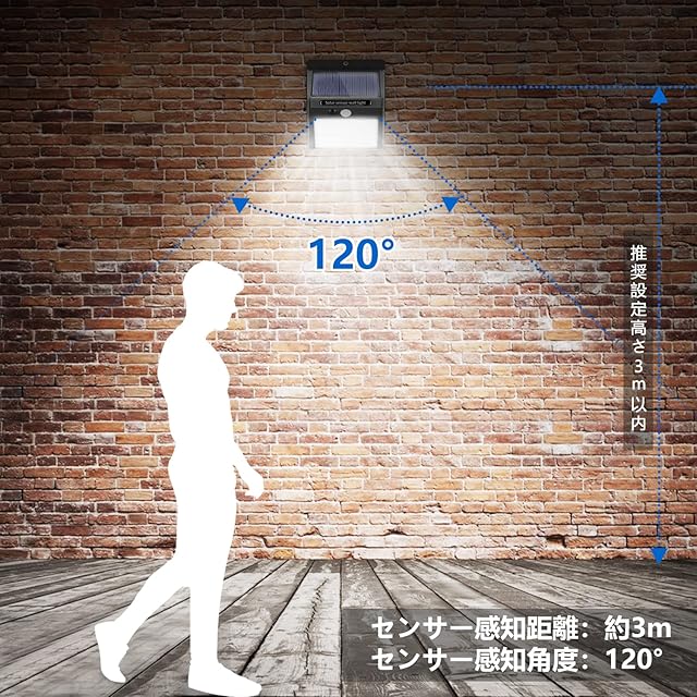 【自動的に高輝度点灯消灯】運動感知センサーが内蔵され、夜や暗くなるんと、人や動物は約3メートル以内の動きが感知でき、自動的に高輝度点灯になって、動きがなくなると約20~25秒後消灯になります。深夜に帰宅する時、足元や鍵口がよく見えて便利です。完璧な停電対策、事故が頻発した田舎には防犯上役に立ちます。感知角度:120° 感知距離:3~6m 照明角度:270°。玄関、軒先、庭、廊下、パーク、ガーデン、ポスト、ベランダ、駐車場など場合に大活躍!素敵な照明効果により夜道も安全、防犯効果も期待できます。