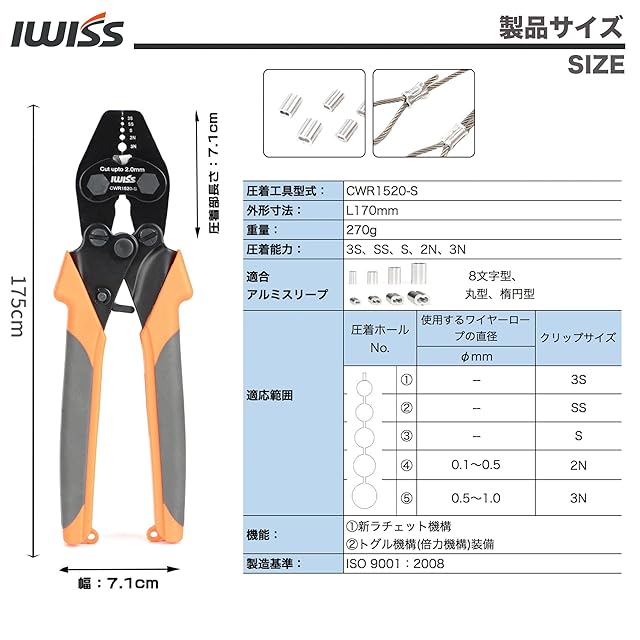 商品名:アイクリンプ(iCrimp) ラチェット式 ハンドプレッサー ダルマスリーブ かしめ機 ワイヤークランプカッター 圧着 切断 1丁2役!スリーブサイズ 3S SS S 2N 3N 対応 CWR1520-S