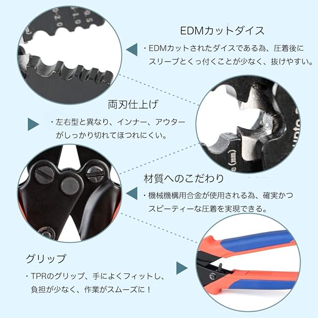 ※新品の場合、圧着工具(新品)のハンドル動作(リングやピン)がかたいことは正常です。しばらくお使いいただくことで少しずつなじみ、軽くなります。