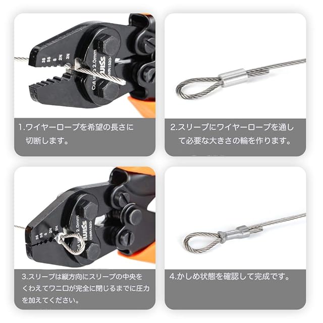 特徴:①特殊ラチェット機構とテコの力で、より一層強力・確実に圧着します。②ワイヤーロープカッター機能付き(φ2.2mm)。