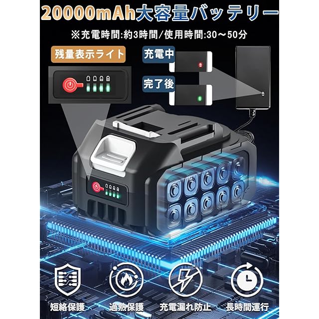 【20,000mAhの大容量バッテリー】充電式高圧洗浄機は、20,000mAhの大容量バッテリー、市販の類似製品の2倍のパワーがあります。フル充電時、最大30-50分钟の連続使用が可能(初回使用前にバッテリーをフル充電してください)。1台分の愛車に総合的な掃除を簡単に対応でき、ベランダや浴室、電源ラインから離れた屋外の入念なお手入れなど、ワイヤレスの自由を満喫できます。 予備バッテリーを購入する必要がなく、マキタ18Vバッテリー対応。