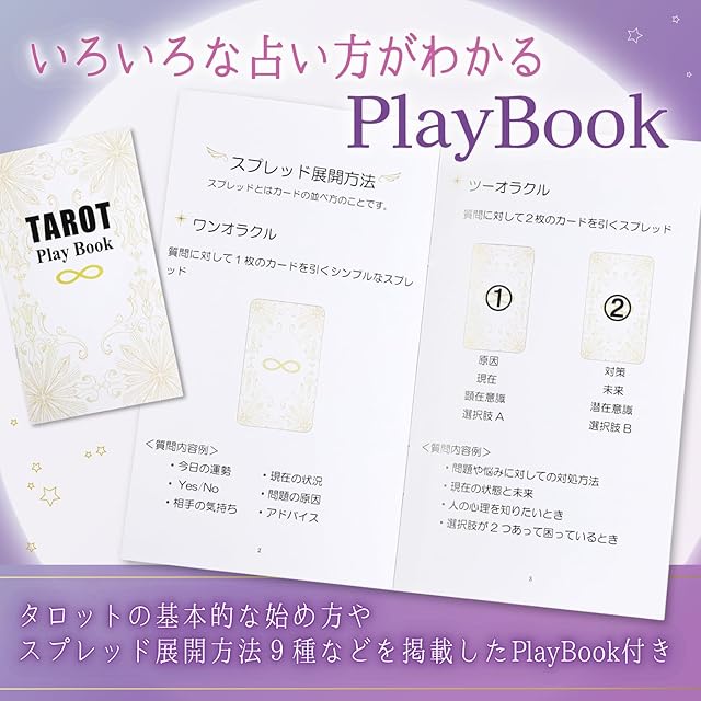 「カードに解説があっても占い方がわからない」「いちいち解説書を開いて探すのが面倒だし時間がかかる」などの不満を解消するために占い方の説明書(Play Book)を付属し、カード自体にわかりやすい解説を書きました。