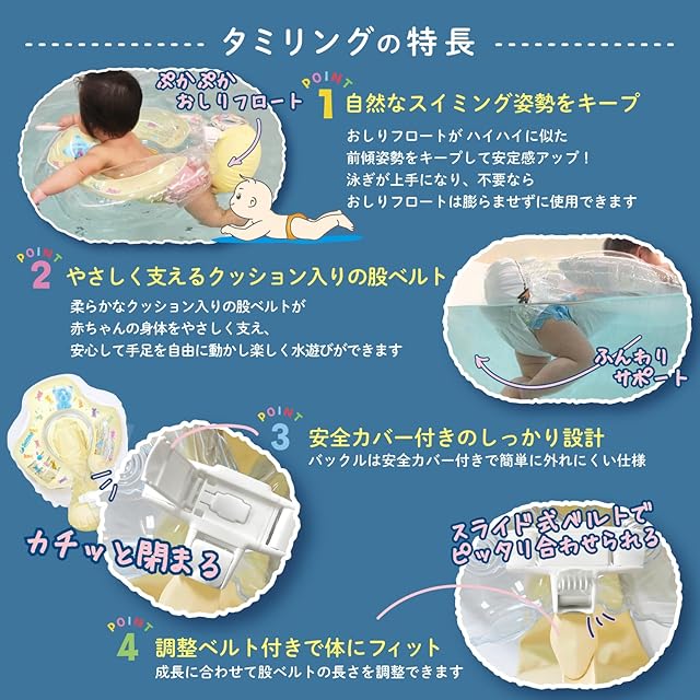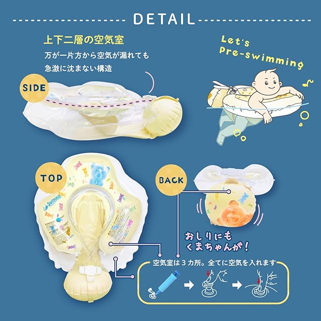 「おしりフロート」がハイハイに似た前傾姿勢をキープし安定感アップ!泳ぎが上手になり不要ならおしりフロートは膨らませずに使用できます。