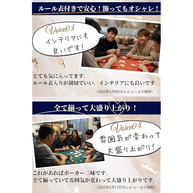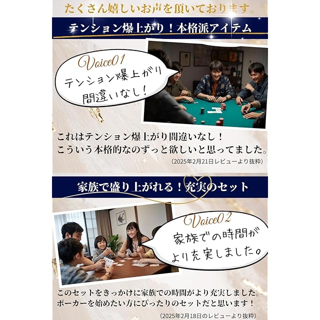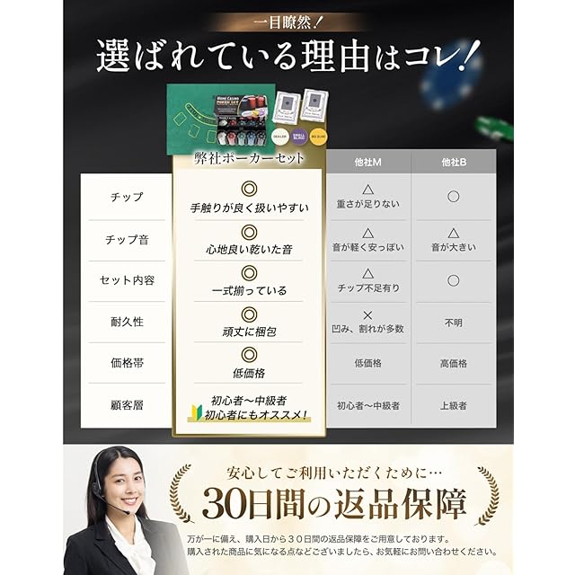 ✅30日間の返品保障 万が一に備え、購入日から30日間の返品保障をご用意しております。購入された商品に気になる点などございましたら、お気軽にお問い合わせください。 ✅【使用上の注意】 ・小さな部品が含まれているため、小さなお子様の手の届かない場所に保管してください。 ・推奨年齢:6歳以上 ・チップや小さな部品を口に入れないようご注意ください。誤飲の危険があります。 ・ゲームは節度を持って楽しみましょう。過度な金銭を賭ける行為は法律で禁止されている場合があります。 ・本製品はカジノゲームの練習や娯楽目的で使用するものです。公営ギャンブル以外の賭博行為は禁止されている場合があります。 ・破損や不具合がある場合は使用を中止してください。