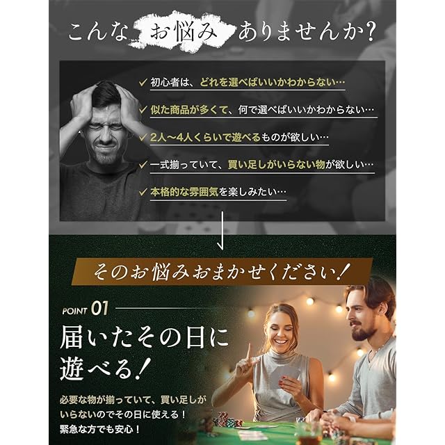 ✅こちらの商品はポーカーフルセットです。チップ=200枚(各5色:40枚)トランプ=2パック プレイマット=1枚(ポーカー、ブラックジャック使用可能) DEALERボタン=1枚 BIG BLIND=1枚 SMALL BLIND=1枚 一式揃っているので届いたらすぐに遊ぶ事が出来ます。初心者から中級者まで幅広くおすすめできるセットです。 ✅こんなお悩みありませんか? 初心者はどれを選べばいいかわからない、、、 似た商品が多くて何で選べばいいかわからない、、、 2人~4人くらいで遊べるものが欲しい、、、 一式揃っていて、買い足しがいらない物♠が欲しい、、、 本格的な雰囲気を楽しみたい、、、 そのお悩みおまかせください! ♠Point 01 届いたその日に遊べる! 必要な物が揃っていて、買い足しがいらないのでその日に使える!緊急な方でも安心! ♠Point02 本格的な雰囲気を楽しめる! チップはずっしりと程よい重量があるので本格的な雰囲気を楽しめる! ♠Point03 盛り上がるチップ音! チップの乾いた音が心地良く、本場さながらに盛り上がる! ♠Point04 チップが扱いやすい! チップの触り心地が良く、扱いやすいので初心者や子供にもおすすめ! ♠Point05 わかりやすい数字表記! チップには数字表記があるので勘違いやトラブルが起きにくく初心者でも遊べる! ♠Point06 収納抜群のチップホルダー! 200枚のチップとトランプ2パックを収納出来るので紛失しにくく、遊びやすい! ♠Point07 持ち運びやすい!収納しやすい! 24×12×10.5cmとコンパクトサイズなので携帯・収納しやすく使い勝手が良い! ♠Point08 充実したフルセット! "チップ=200枚(各5色:40枚) トランプ=2パック プレイマット=1枚(ポーカー、ブラックジャック使用可能) DEALERボタン=1枚 BIG BLIND=1枚 SMALL BLIND=1枚" ♠Point09 安心のトランプ2パック! 1つがダメになっても安心の充実2パック! ♠Point10 雰囲気の出るプレイマット! ブラックジャック用としても、ポーカー用としても使用可能!サイズ:縦58cm 横90cm ✅30日間の返品保障 万が一に備え、購入日から30日間の返品保障をご用意しております。購入された商品に気になる点などございましたら、お気軽にお問い合わせください。 ✅【使用上の注意】 ・小さな部品が含まれているため、小さなお子様の手の届かない場所に保管してください。 ・推奨年齢:6歳以上 ・チップや小さな部品を口に入れないようご注意ください。誤飲の危険があります。 ・ゲームは節度を持って楽しみましょう。過度な金銭を賭ける行為は法律で禁止されている場合があります。 ・本製品はカジノゲームの練習や娯楽目的で使用するものです。公営ギャンブル以外の賭博行為は禁止されている場合があります。 ・破損や不具合がある場合は使用を中止してください。