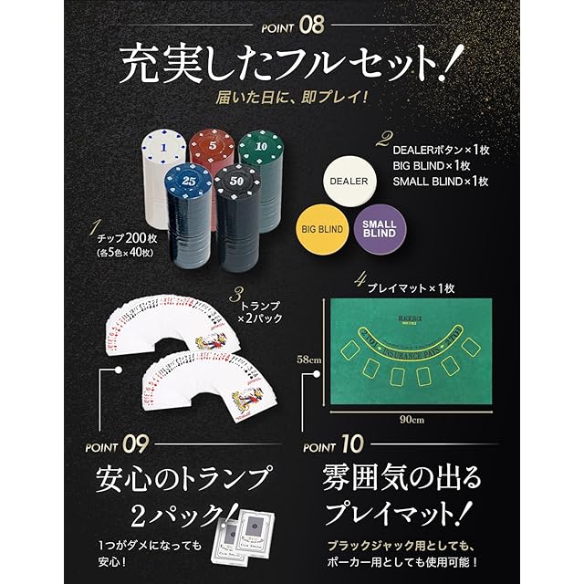♠Point08 充実したフルセット! "チップ=200枚(各5色:40枚) トランプ=2パック プレイマット=1枚(ポーカー、ブラックジャック使用可能) DEALERボタン=1枚 BIG BLIND=1枚 SMALL BLIND=1枚"