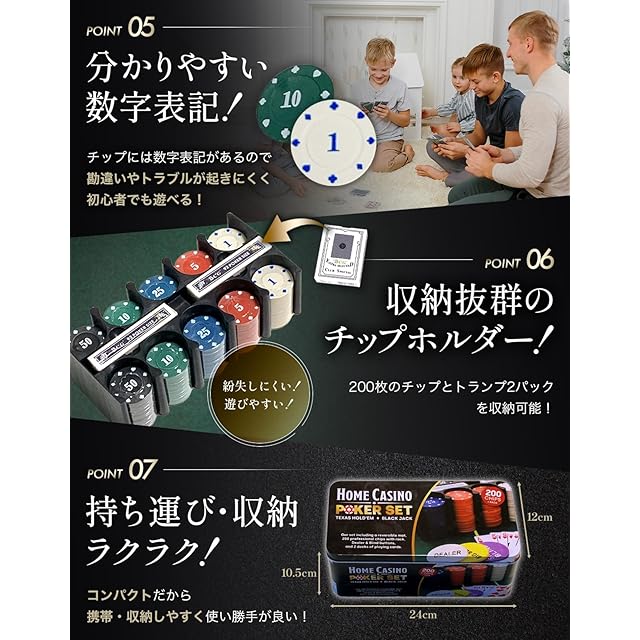 ♠Point06 収納抜群のチップホルダー! 200枚のチップとトランプ2パックを収納出来るので紛失しにくく、遊びやすい! ♠Point07 持ち運びやすい!収納しやすい! 24×12×10.5cmとコンパクトサイズなので携帯・収納しやすく使い勝手が良い!