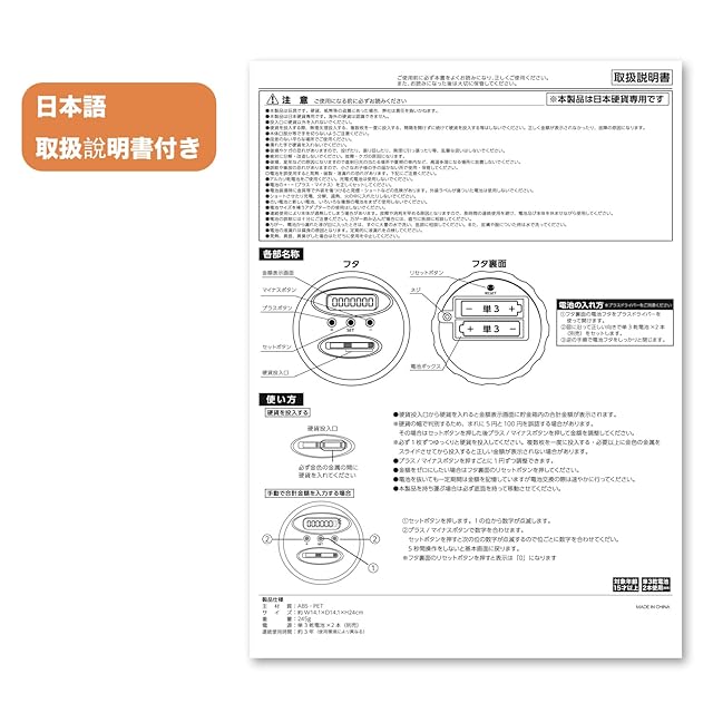 サイズ:12.3 * 17.5 * 15.8 cm。 </br> 1円玉〜500円玉まで全ての硬貨を識別できます。 ※日本の硬貨のみ対応。 </br> 500円玉600枚で30万円貯められる貯金箱。 </br> 2A単三電池が二本必要です。(別売り) </br> 日本語取扱說明書付き