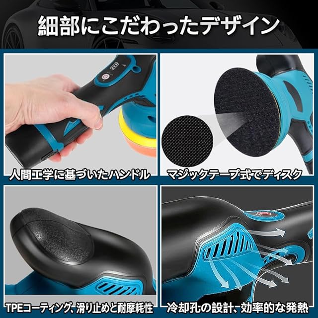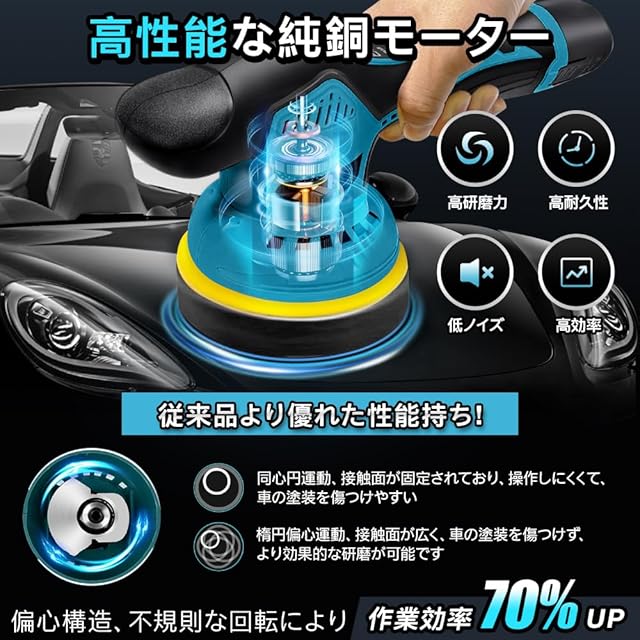 商品名:YUUYOU ポリッシャー 車 8段階変速 和式ポリッシャーバフ付き 125mm 1.5Ahバッテリ一2個搭載 12V 電動ポリッシャー コードレス 5500RPM 強力ポリッシャー 充電式 研磨機 ダブルアクションポリッシャー 偏心構造 残量表示 小型 軽量 豊かな付属品 洗車 車磨き 鏡面磨き 傷消し 艶出し 研磨 ワックス作業 家庭用