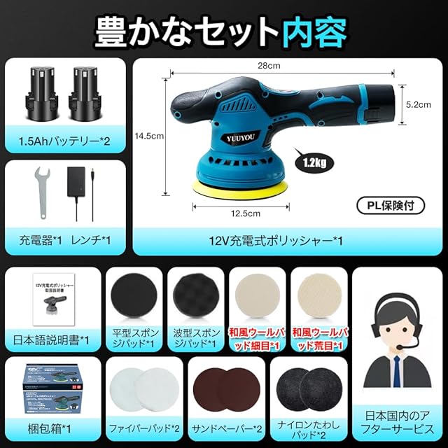 ▲【パッケージ内容★12ヶ月品質】セット内容:12V充電式ポリッシャー*1、1.5Ahバッテリー*2、和風ウールパッド細目*1、和風ウールパッド荒目*1、波型スボンジパッド*1、平型スポンジパッド*1、ナイロンたわしパッド*2、ファイバーパッド*2、サンドペーパー*2、日本語説明書*1。本体重量:1.2kg、サイズ:28*14.5*12.5cm。YUUYOUブランドを提供する有容合同会社は信用とサービスを重視する日本の会社です。弊社のポリッシャーにはPL保険に加入し、PSE認証も取得しておりますので、ご安心してご利用ください。また、YUUYOUポリッシャーは12ヶ月品質とアフターサービスを提供しております。ご質問があった場合、又は万が一商品に不具合が生じた場合があるなら、いつでもお気軽にお問い合わせください。必ず最善を尽くし、サービスを対応致します。