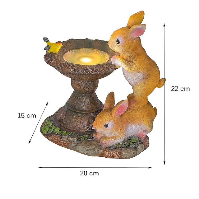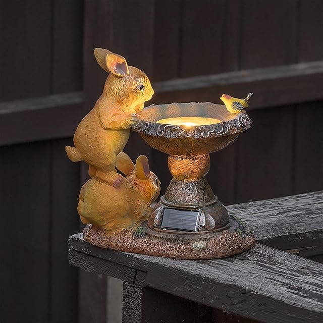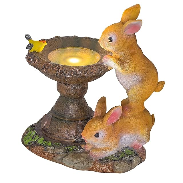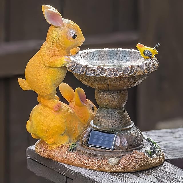屋外のウサギの装飾品:プールで金魚を見て、ウサギの上にオレンジ色のウサギが立っている、鳥の浴場の上に立っている飛んでいる鳥。自然の雰囲気をあなたの家に持ってきてください..