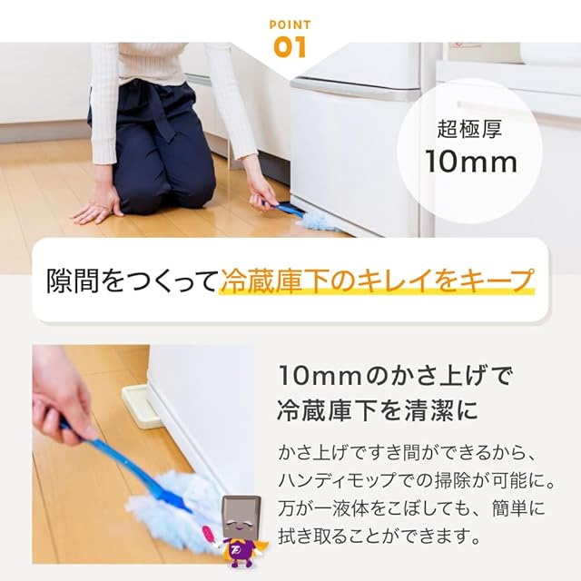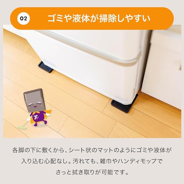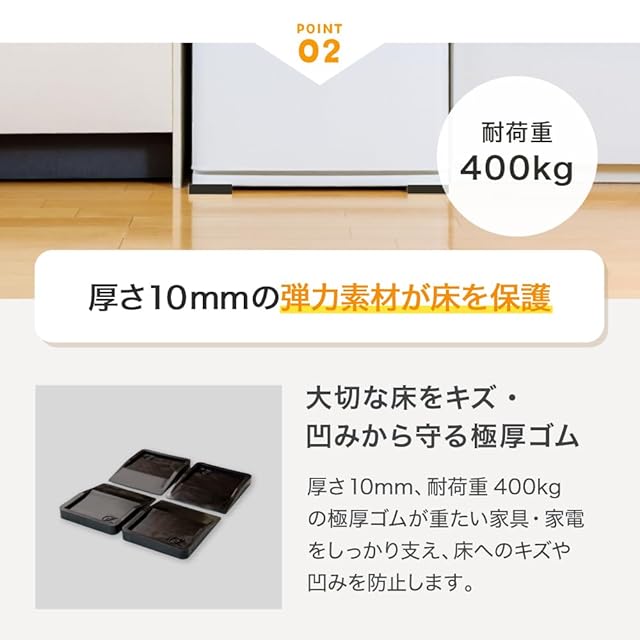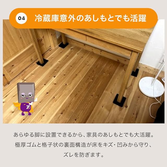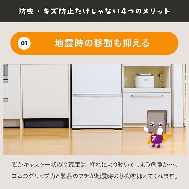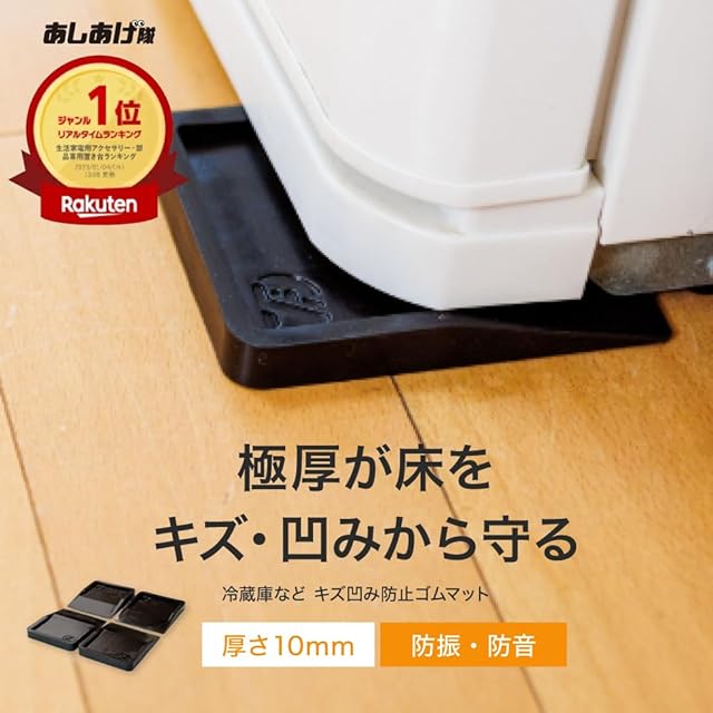 ★「あしあげ隊」はシリーズ累計150万セット突破★冷蔵庫の下に敷くことで、床への傷やヘコミを防止するゴムマットです。冷蔵庫以外にも大型家電やソファー等の家具の脚からも床を保護します。