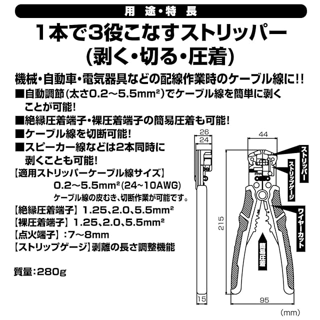 ケーブルの皮むき適応範囲:AWG24~10(0.2~5.5sq)