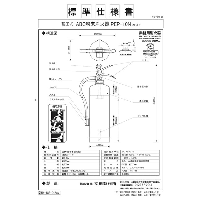 商品名:初田製作所 消火器 PEP-10N 本体: 奥行20cm 本体: 高さ46.7cm 本体: 幅22.0cm レッド