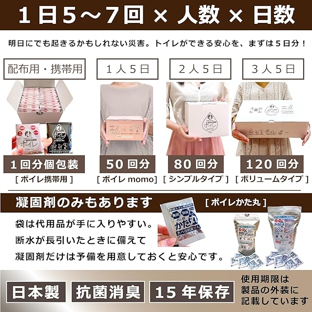 80回分の凝固剤と排便袋が入っており、家族の単位として考えやすい2人で5日分を目安としています。 災害時や緊急時など、トイレの水が流せない時のための非常用トイレです。 『簡易トイレを目に付くところに保管してもらいたい』というコンセプトで、シンプルなデザインのパッケージです。可能な限り省スペースでコンパクトにまとめ、防災備蓄として長期間の保管に備え、しっかりと丈夫な段ボール箱です。