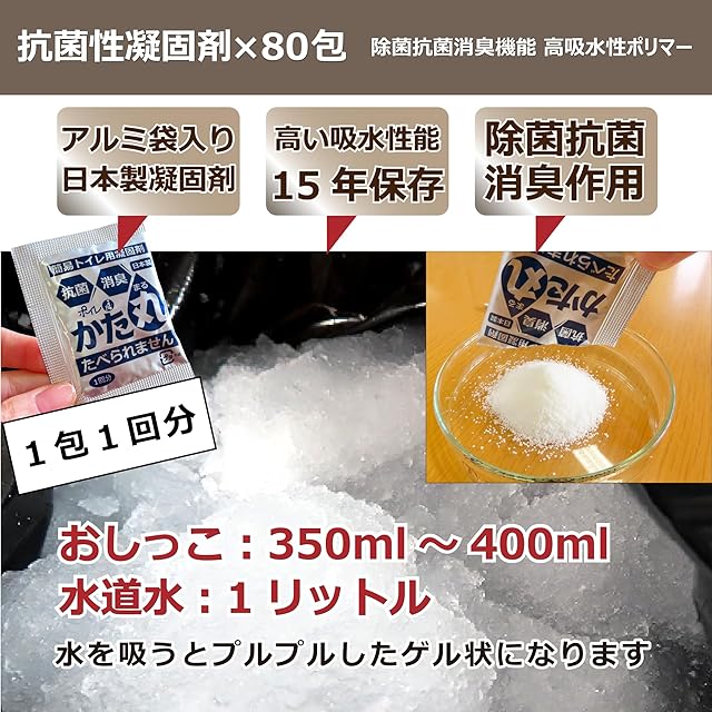 【 凝固剤 】 1回分ずつアルミパウチで密封された防湿・防水仕様の日本製凝固剤です。 高吸水性ポリマーを主成分とし、排泄物の水分を素早くゼリー状に固めます。 アンモニアやメチルメルカプタンなど、主要な4大悪臭成分に対する消臭性能と、代表的な菌種に対する除菌性能を備えています。 ただし、人間の排泄物は体調や食事によって変化する複合臭であり、完全な無臭にはできません。 当製品は、凝固作用をしっかり維持しながらも、可能な限りの消臭・抗菌効果を両立させた設計となっています。 凝固スピードだけを数秒早めるよりも、「しっかり固まり、衛生リスクを抑える」ことを最優先に設計しております。 災害時の衛生環境を守るため、長時間の使用後でも効果が続くよう調整しています。 ※粉末タイプのため使用時に舞うことがあります。袋を開く際や投入時に顔を近づけすぎないようご注意ください。