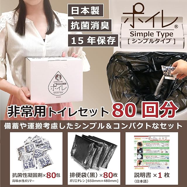 商品名:ポイレ シンプルタイプ 80回分 簡易トイレ 携帯トイレ 日本製 15年保存 抗菌 消臭 凝固剤 排便袋 災害トイレ 防災 防災士監修
