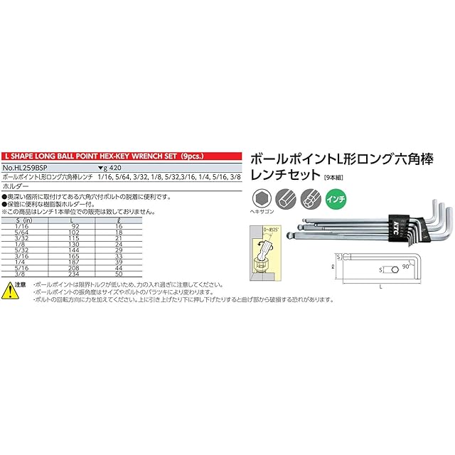 商品名:京都機械工具(KTC) ボールポイント L型 ロング六角棒レンチ セット 9本組 HL259BSP
